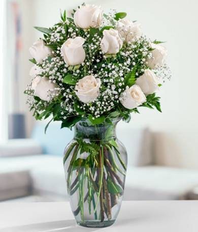 Arreglo de 24 de rosas blancas en florero de vidrio